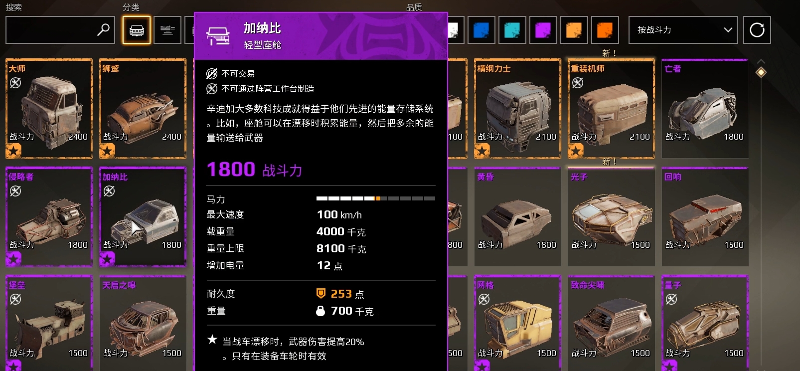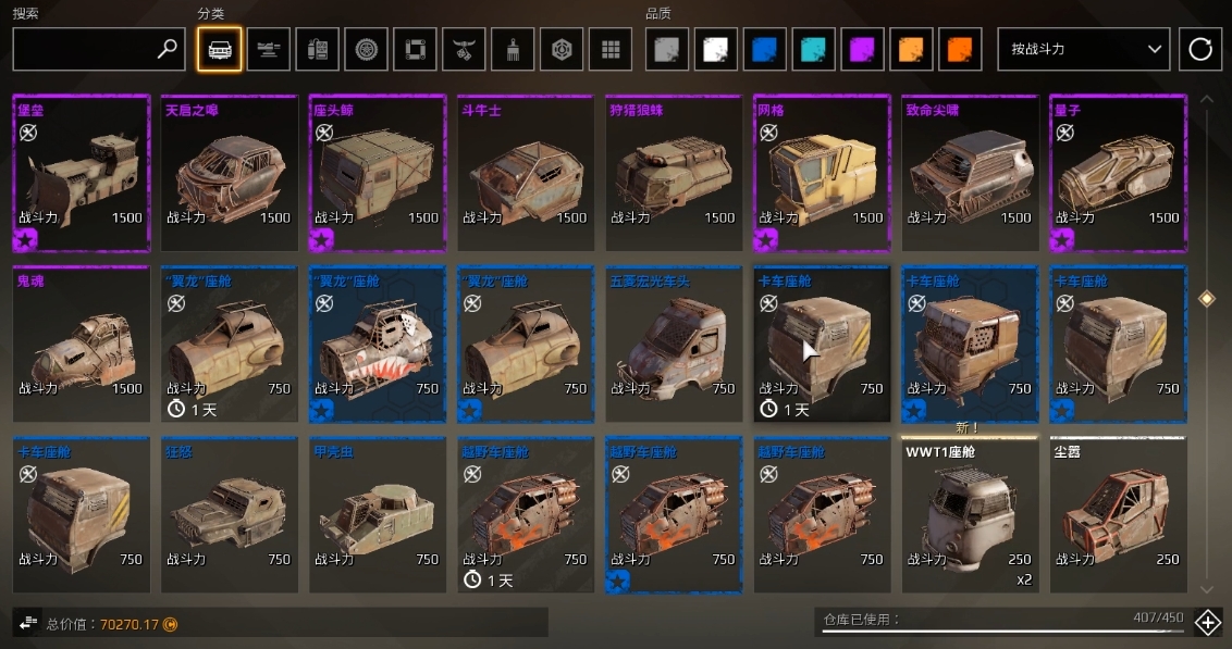 目前游戏内的驾驶舱大体分为三种,分别是重型座舱、轻型座舱以及中型座舱,这三种驾驶舱的选择搭配技巧是不一样的,先从品质来为大家介绍,游戏内的驾驶舱分为六种不同的品质。其中传说和遗迹是品质最高的,也是大家选择频率最高的,而遗迹获取难度又高,综合而言,还是传说的驾驶舱性价比更高,它的获取难度是大家可以接受的,同时培养价值也是还不错的,能够适用于不同的战车版本。
