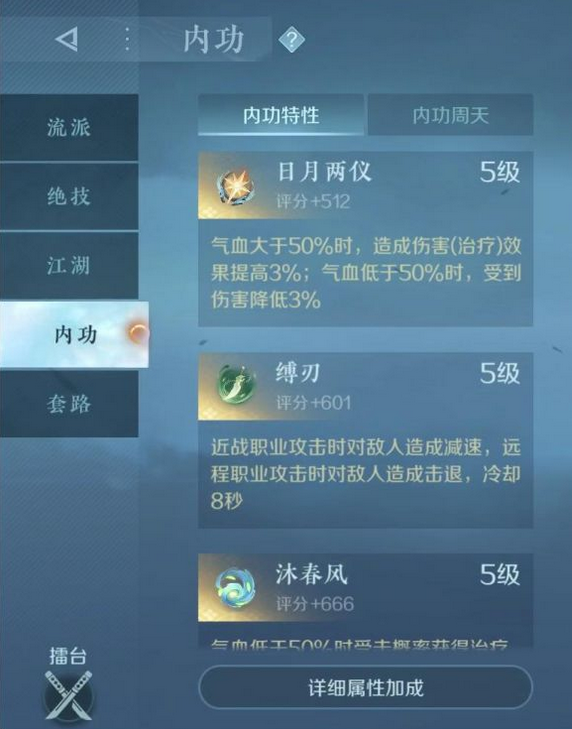 但如果大家感觉获取到的日月两仪或者是昆吾断玉词条比较差,也可以选择另外词条比较好的燎原或者是焚秽来代替。在绝技方面默认是大闹天宫,内功选择是以词条为主,这一点大家要把握住。在这些技能强度方面,其实词条一般的日月已经没有太大的优势,多一条攻击词条的燎原或者是焚秽已经完全能超越。如果日月没有升级,那更是没有可选项。