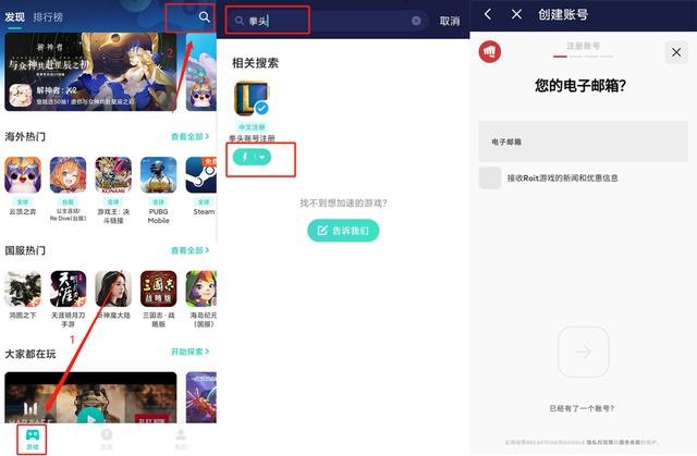 和第一步一样,点击“网易UUAPP”的“搜索”按钮,搜索“拳头”,找到“拳头账号注册”,点击加速后选择想要游玩的地区,UU就会自动加速,并跳转至中文注册界面。