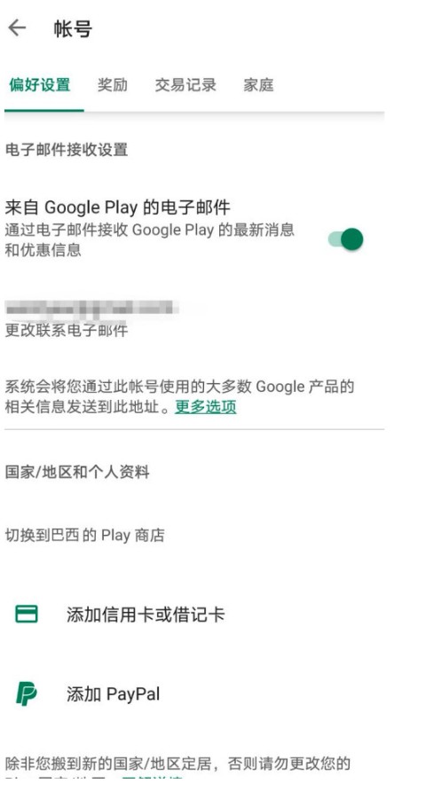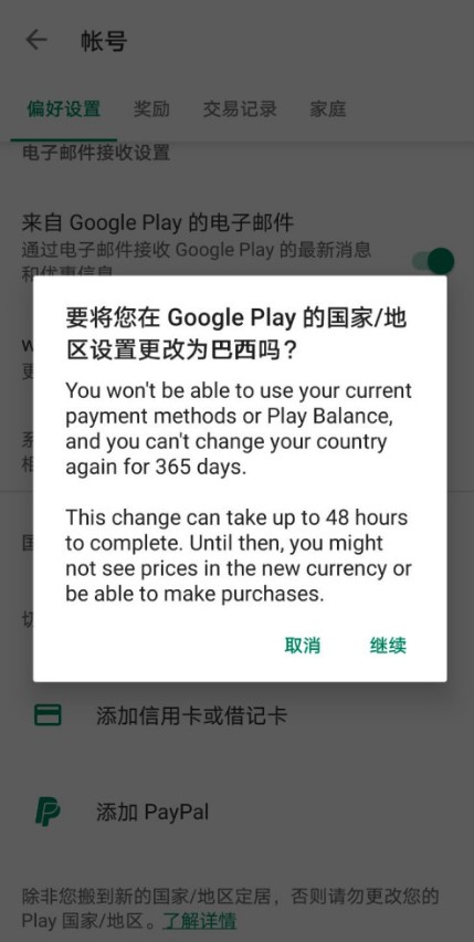 3:点击下方 添加信用卡或借记卡 会弹出切换地区提示(需注意Google Play一年只可以切换一次地区)
