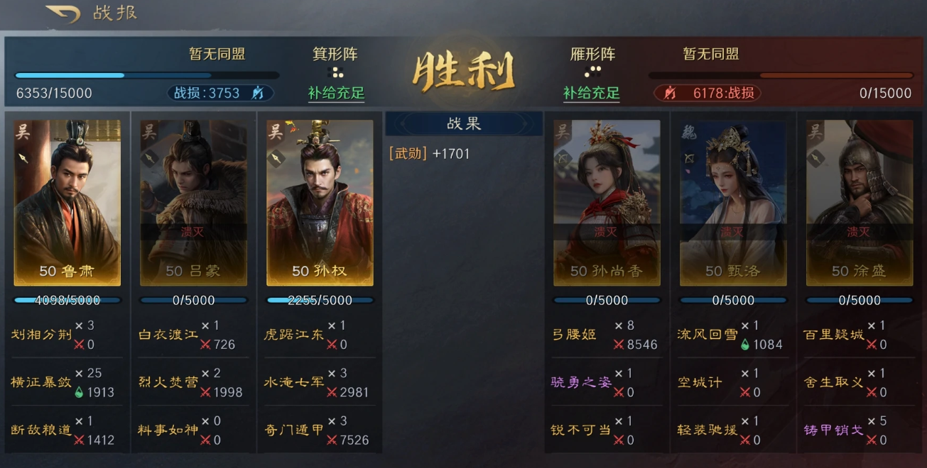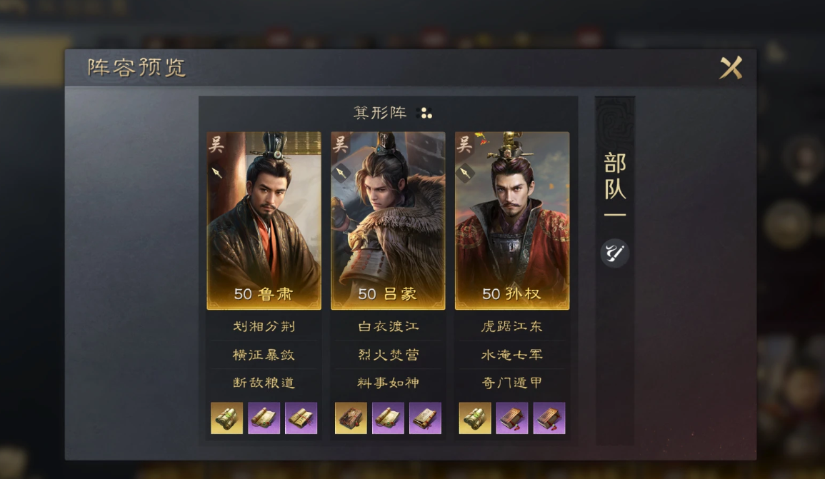 这时候鲁肃一定要带一个可以对敌人造成断粮效果的技能,可以增加队伍里所有人的伤害。然后吕蒙再进行先攻,这时候同样可以让敌人断粮。接着孙权在进行全体控制,让所有对手都动弹不得,接着补上足够高的爆发伤害即可。