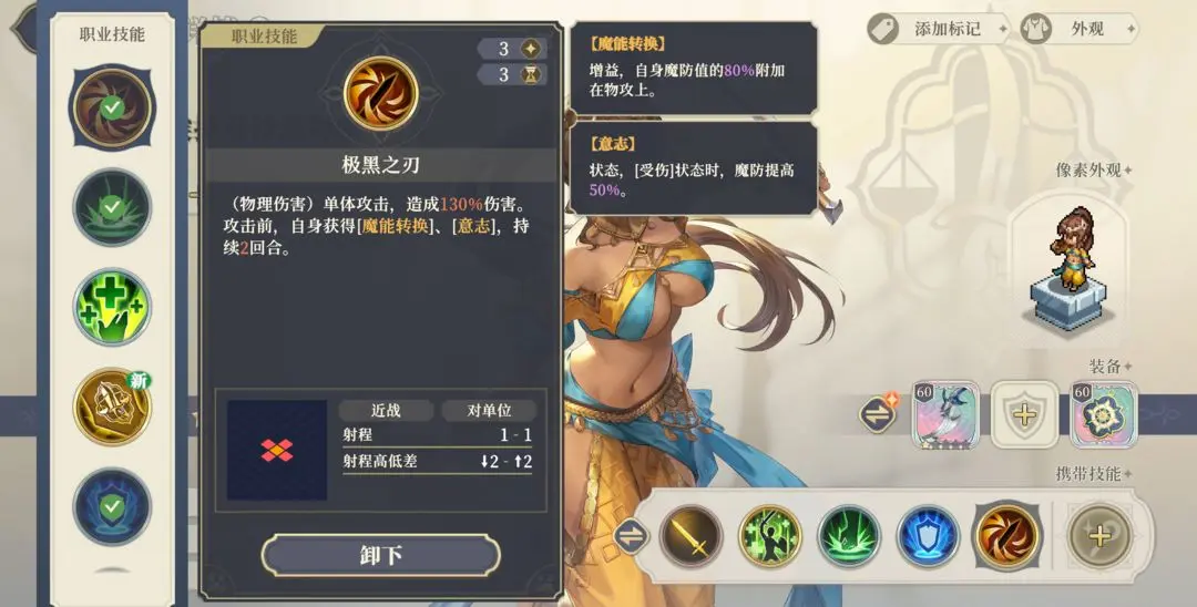 极黑之刃是值得关注的输出技能,与舞娘提升魔防的特性相得益彰,可根据战况选择携带。