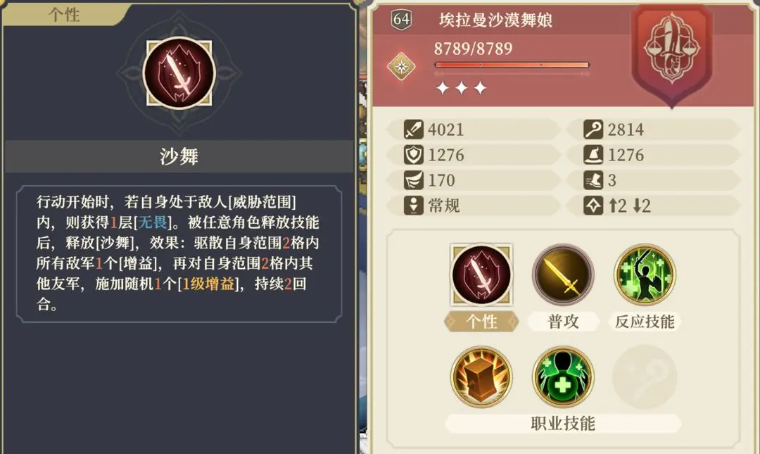 相比敌方版本,我方沙漠舞娘移除了驱散能力,但提升了基础攻防属性。极黑之刃技能为其提供了额外的输出手段。