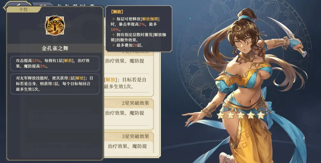 沙漠舞娘个性使其在释放技能时能为目标赋予解放层数,该效果包含战地治疗等被动技能触发,但每个目标每回合仅能生效一次。该机制与解放体系角色有良好配合。