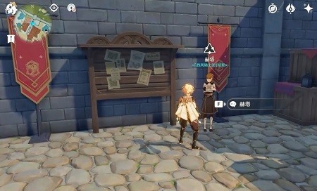 在游戏中,玩家需要来到蒙德城如图所示的位置,玩家需要找蒙德城内的NPC赫塔来领取对应的奖励。在大地图中,声望奖励所对应的图标为一个三角形的外观。