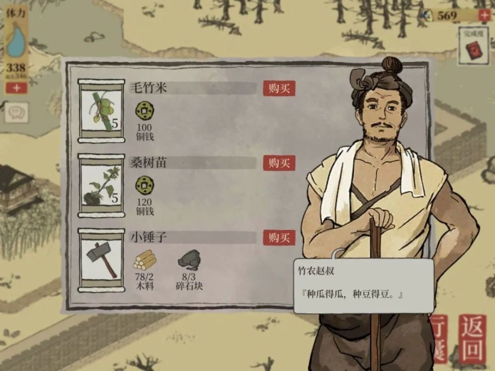 此处提示:桑叶可以回现实里砍桑树,这样比较快。虽然可以在现实砍,但还是会有种桑树、摘桑叶的任务。桑树苗可以在竹农那里买。