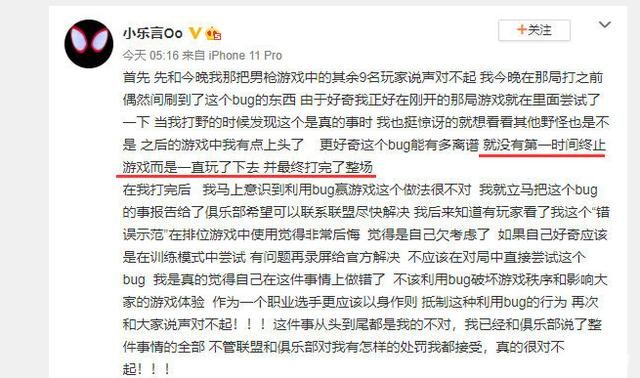 由于当时小乐言用自己的认证账号卡BUG瞬秒大龙,导致他被很多主播举报,其中就有前RNG上单姿态,对此姿态是这么说的:作为一个职业选手,他这么做是带坏游戏风气,我既然发现了,那就一定要把风气带回来。虽然姿态平时打游戏总喜欢怪队友,但是关键时候一点都不含糊,对于这件事小乐言已经意识到自己的错误了,在造成恶劣的影响之后感到后悔,最后表示自己愿意接受任何俱乐部以及的惩罚。虽然小乐言别的地方做得不好,但是敢于认错,人品还是没问题的,只不过有点过于肆意了。
