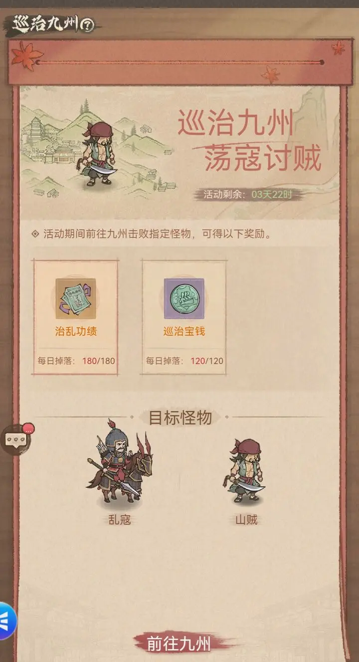 巡治九州活动为玩家提供了获取稀有客卿和实用道具的重要机会。本攻略将详细介绍活动玩法、奖励兑换优先级及资源规划建议,帮助玩家高效参与活动并最大化收益。