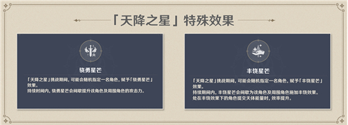 在「回收陨星残骸」与「天降之星」挑战中,「「公子」·达达利亚(水)」「星天水镜·莫娜(水)」「断罪皇女!!·菲谢尔(雷)」「蔷薇魔女·丽莎(雷)」「无冕的龙王·北斗(雷)」「掩月天权·凝光(岩)」「未授勋之花·诺艾尔(岩)」「雪融有踪·重云(冰)」「万民百味·香菱(火)」造成的伤害提高60%。
