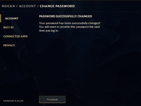 7.看到上面这句话才表示拳头账号密码修改成功了,点击下方的“Finished”结束该事件。