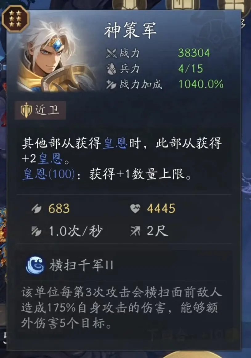 被低估的皇恩牌储备幻神。通过天策军存储大量皇恩牌,后期一次性释放可实现战力飞跃。实测搭配钻石虎豹骑战力可达67万。