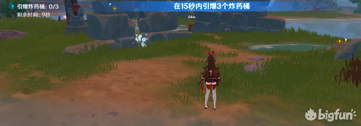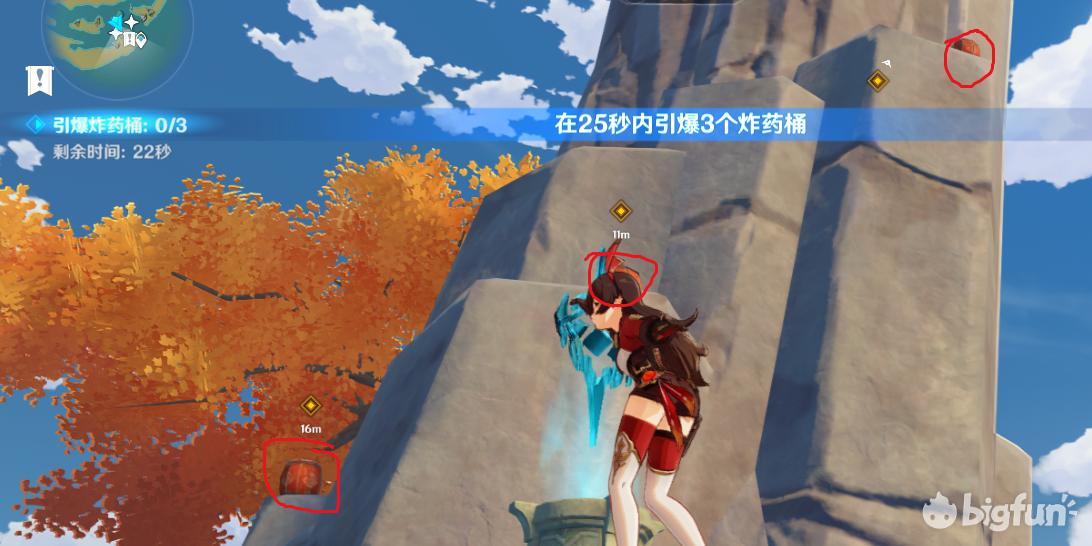 15秒引爆3个炸药桶,难的是瞄准1、可以在图中这个位置先放一个安柏玩偶,再开启挑战。