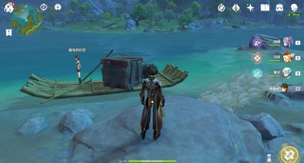 我们来到npc这里之后,发现NPC的位置在船上,而我们到船上是必须沾到水的,我们可以使用岩主来释放e技能,释放一个石柱,踏着石柱来到NPC的船上。也可以使用凯亚等冰元素角色将水面冻住,从而从冰面上面走过去,也不会沾染到其他的元素。