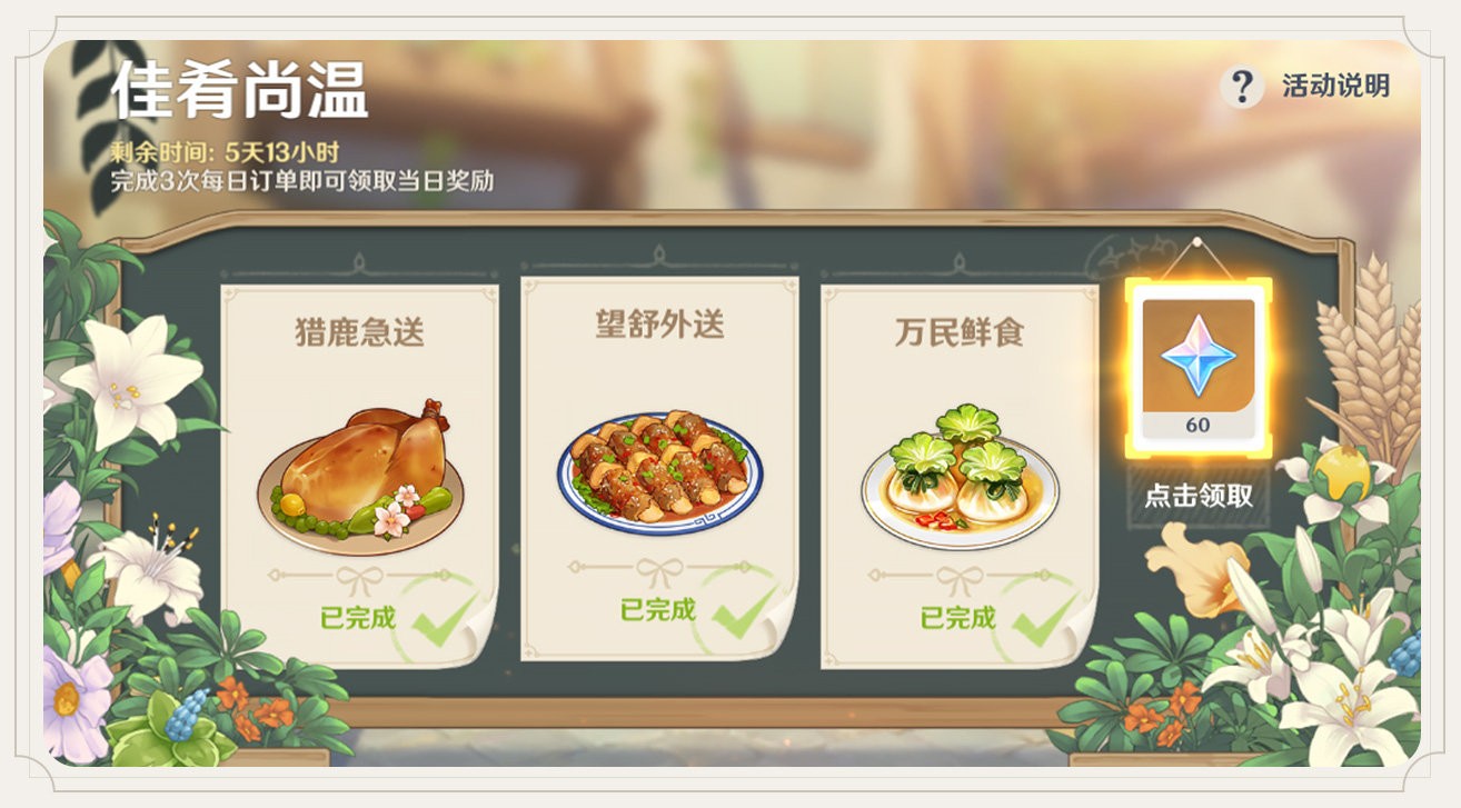 「佳肴尚温」活动现已开启,旅行者们完成指定任务可获得摩拉、角色突破材料、冒险家的经验、精锻用魔矿、原石等奖励。