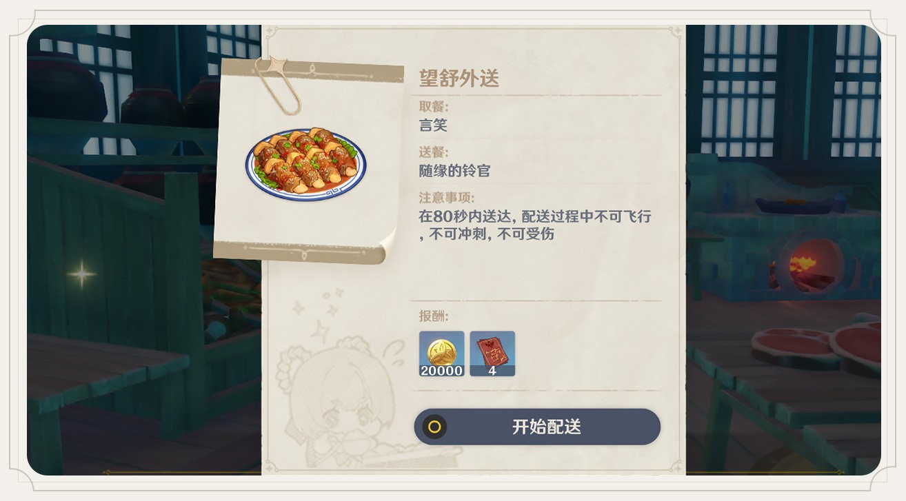 接受订单后,倒计时将会开启。旅行者们在递送时不可以违反附加要求,同时需要在倒计时结束前将餐食递送至目标处。否则,将会导致任务失败,需要重新在NPC处接受订单。