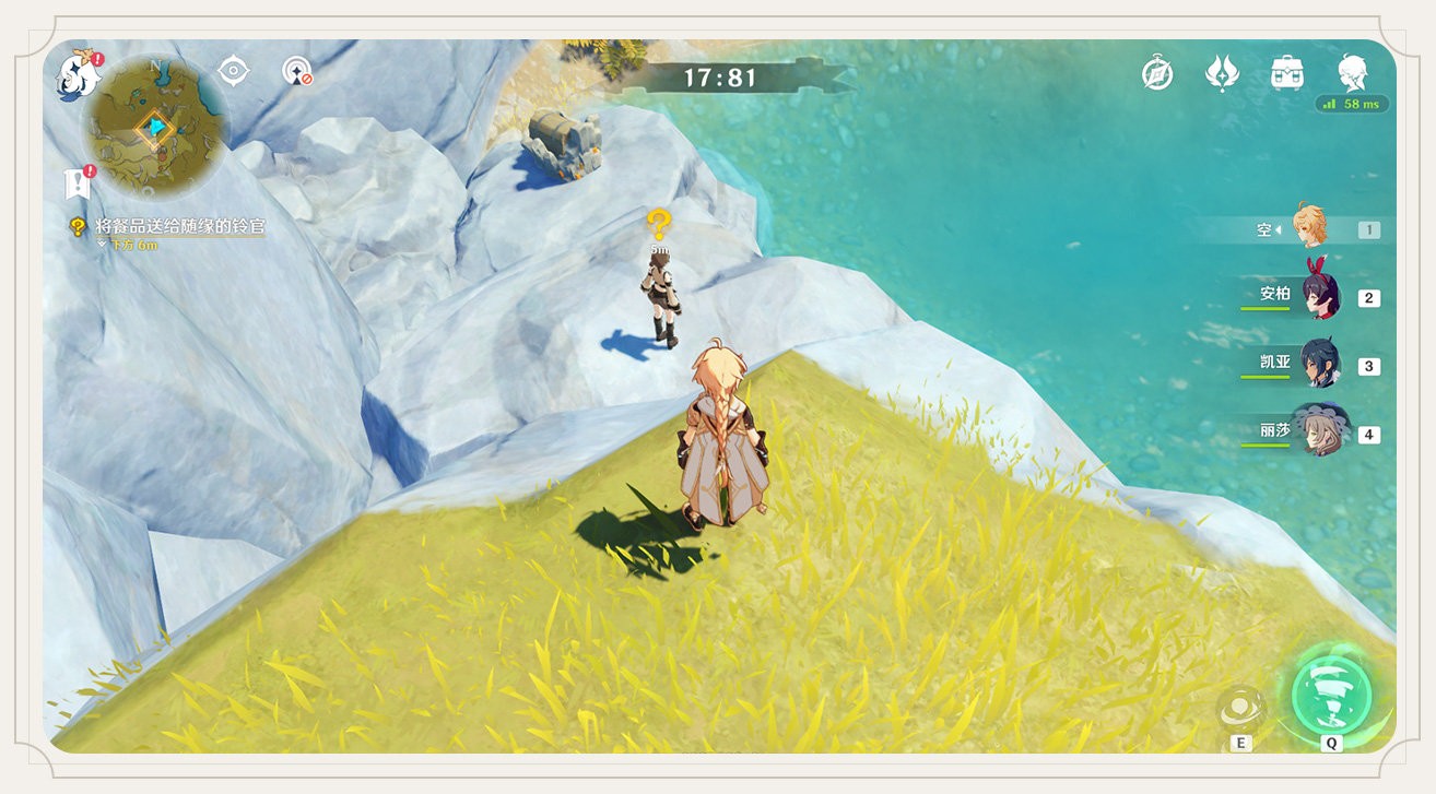 我们能够看到望舒外送是需要我们送到NPC铃官的手中,要求是在90秒钟送达,且不能沾染各种元素,不能受伤,这次的条件就没那么苛刻,没有说不可以飞行和不可以冲刺,这样可以节省不少的时间。但是这次的客人是在水中,而且我们是不可以沾水的,沾水也算是沾染元素,所以我们需要想办法来度过水面且不沾到水。