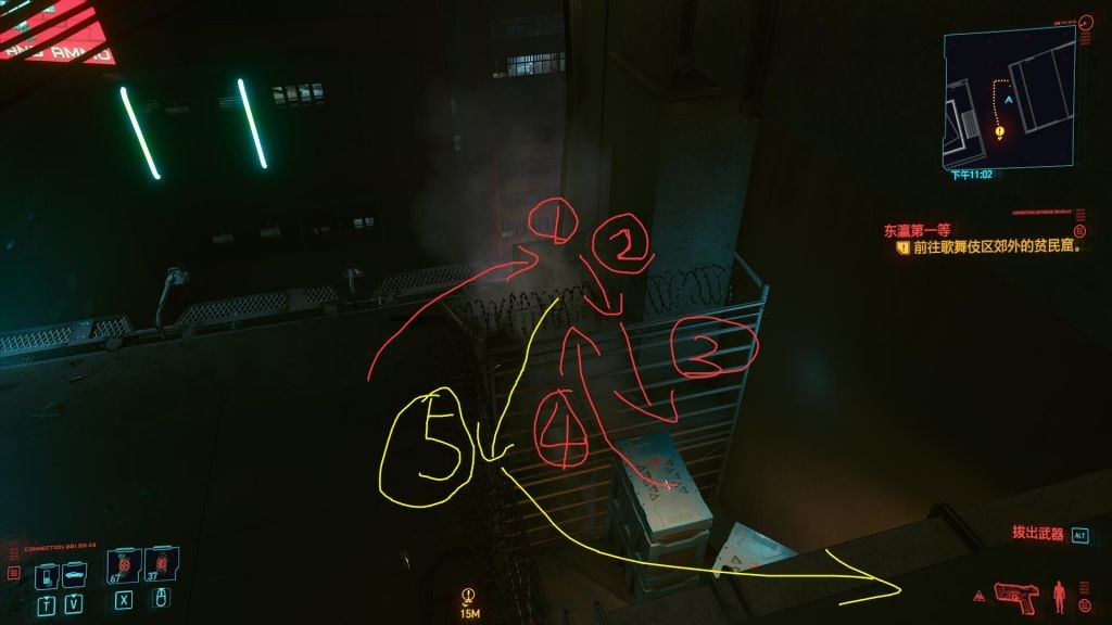 然后按住W和空格多试几次可以强行翻过2号箭头指着的铁丝网