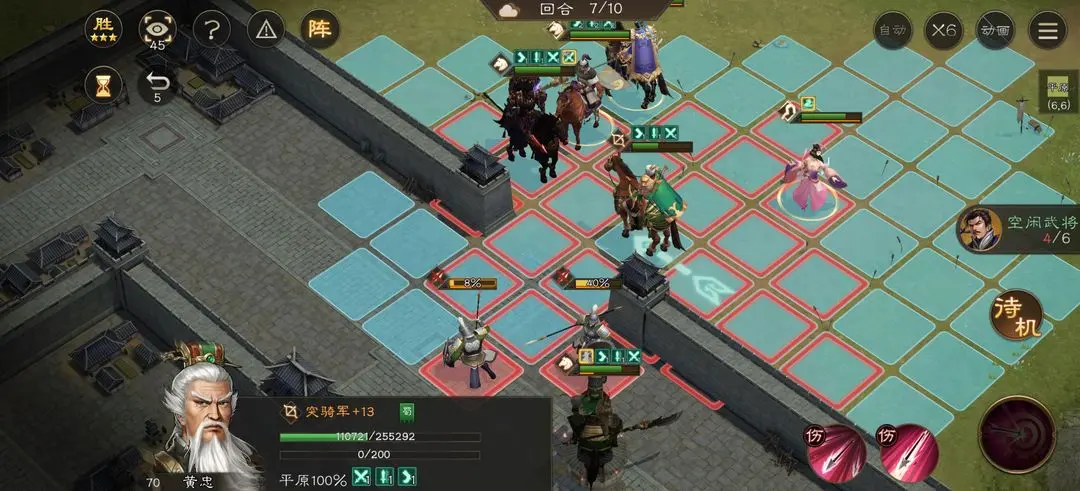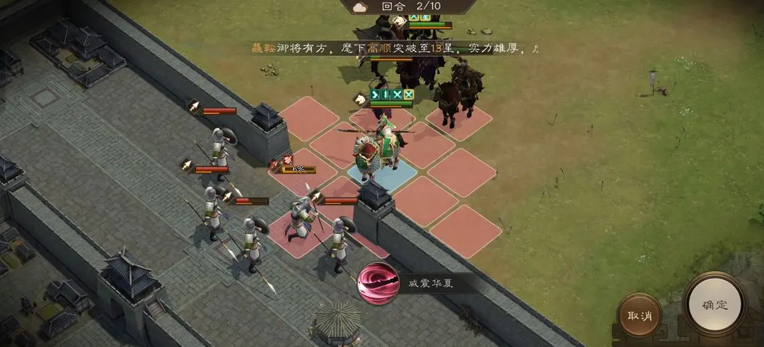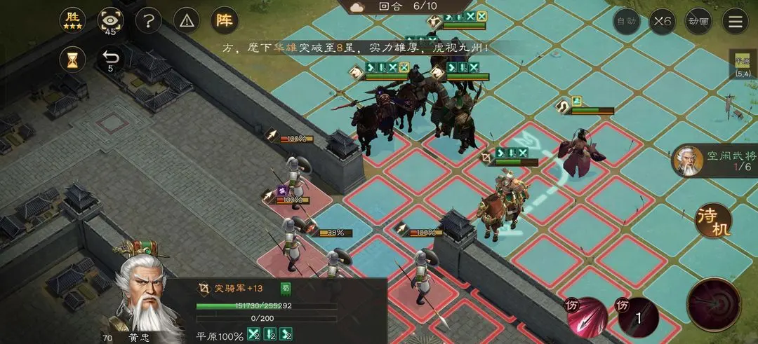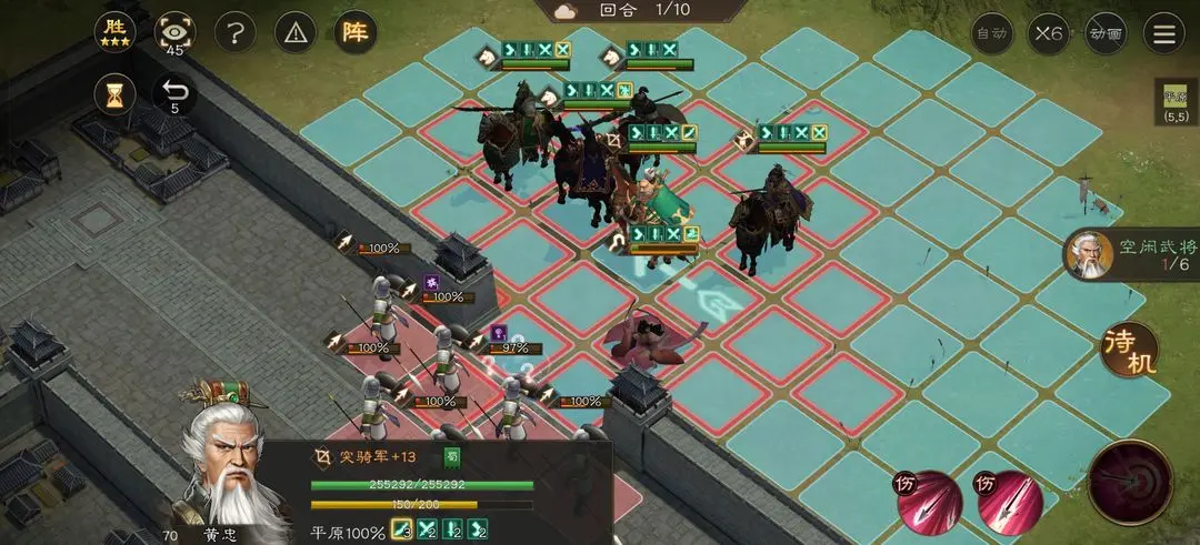 秒掉这两个小兵就一个等待华雄嘲讽技能冷却没了再去打了。到第六回合华雄技能好了再去嘲讽第二排第一个小兵,站位如图这样小兵就打不到华雄了。