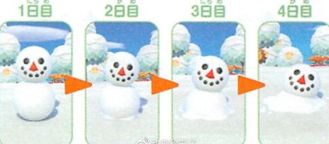 如果岛上还有另一个账号的住民,那么也可以在堆出完美雪人的第一天和完美雪人说话,并获得一张DIY配方,但2~4天的时候对话就不送东西了。把冬季限定DIY全部制作出来的话,会随机得到一个完成品的礼物(邮箱)。顺便说一句,「小雪花」和樱花啊枫叶啊这些东西一样,是在空中飞舞,可以用虫网捕捉的。