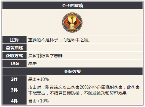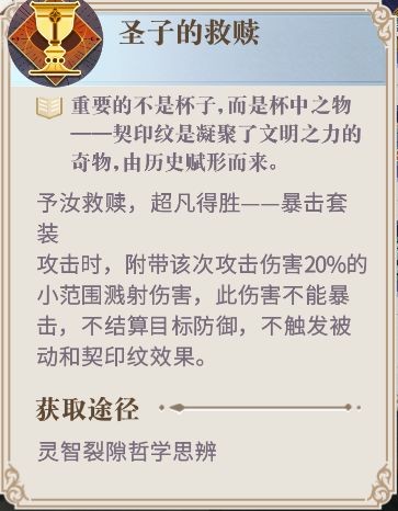队伍的主力输出一般以群攻幻书为主,【圣子的救赎】不但可以提升幻书的暴击,同时特殊效果可以让幻书攻击时额外附带20%的小范围溅射伤害,对于小范围群攻幻书来说,这个效果变向增大了他们的输出范围,是小范围群攻幻书最好的帮手。