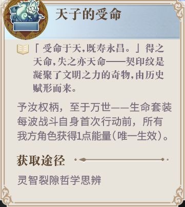 首先对于推图阵容来说,前排幻书是必不可少的。而【天子的受命】的套装效果不但可以增加幻书的生命值,同时还可以让装备这套契印纹的幻书在行动时,为我方所有幻书增加1点能量,从而让队伍在第一轮就可以直接发动书界技能打出爆发伤害,因此是前排必带的契印纹,需要注意的是,这套契印纹的效果是唯一的,所以只要有一本幻书携带就可以了。